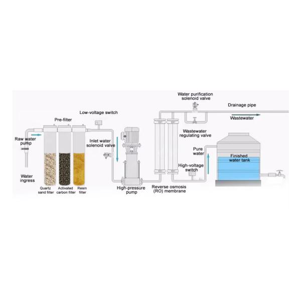 Usually there are three parts: pretreatment, RO machine, and post treatment. Pretreatment could be UF(ultra filtration) system,anti-scale dosing system, flocculant dosing system, disinfectant dosing system, water softener, sand filter, carbon filter,security filter etc. Post treatment could be UV sterilizer, Ozonizer, ClO2 sterilizer, etc. And maybe you need an EDI system. We will choose proper process according to your raw water quality and permeate water purpose.